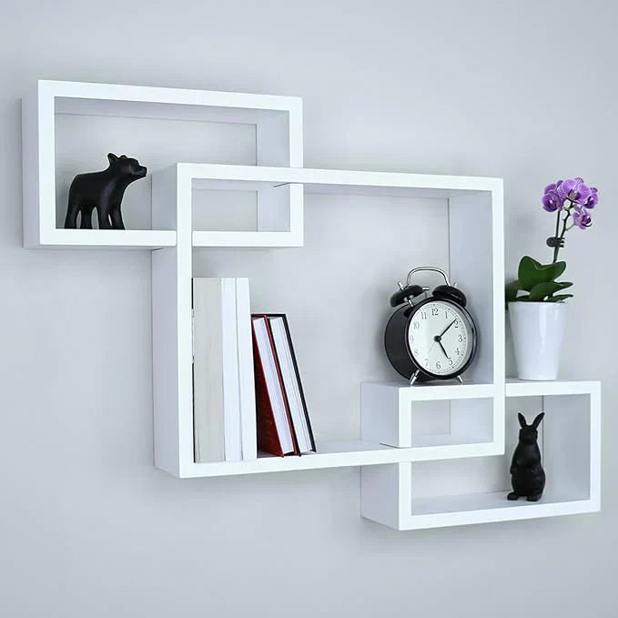 - DETAILS: Set of 3 intersecting decorative shelves for wall. These unique shelves can be hung horizontally or vertically to match your preferences.